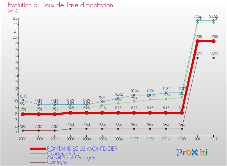 A Fontaine-sous-Montdidier, le taux de taxe d'habitation a ainsi augmenté de 145.01 % entre 2000 et 2012.