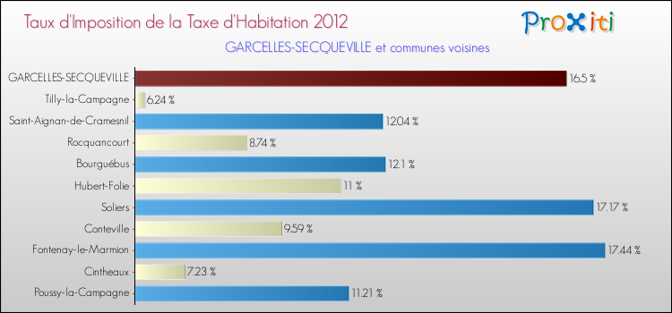 Vous trouverez ci-dessous des graphiques qui vous permettent de situer le taux de la taxe d'habitation de Garcelles-Secqueville par rapport aux communes voisines.