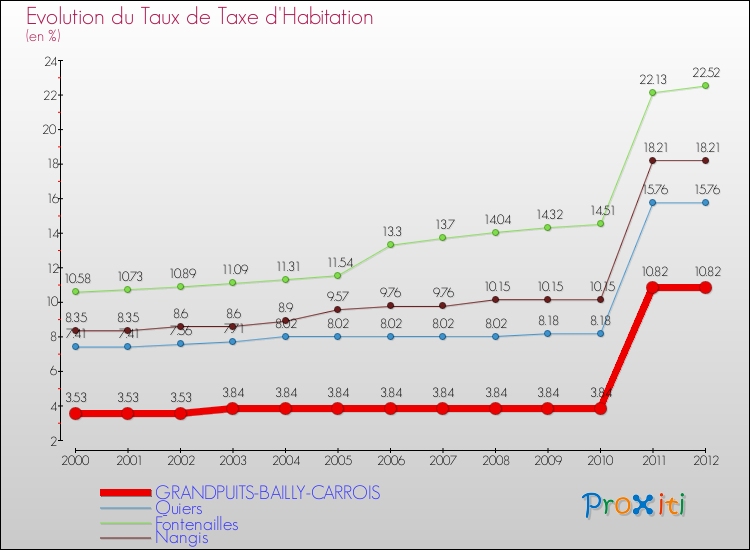 En 2012, le taux de la taxe d'habitation vôté par le conseil municipal de Grandpuits-Bailly-Carrois était de : 10.82 %.