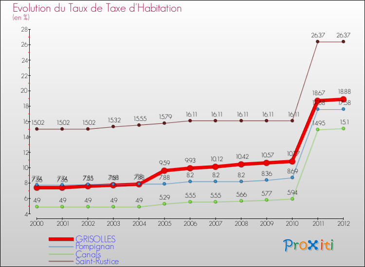 A Grisolles, le taux de taxe d'habitation a ainsi augmenté de 156.52 % entre 2000 et 2012.
