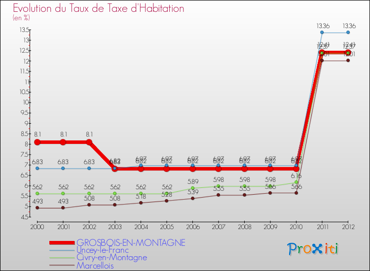 A Grosbois-en-Montagne, le taux de taxe d'habitation a ainsi augmenté de 53.21 % entre 2000 et 2012.