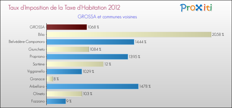 En 2012, le taux de la taxe d'habitation vôté par le conseil municipal de Grossa était de : 10.68 %.