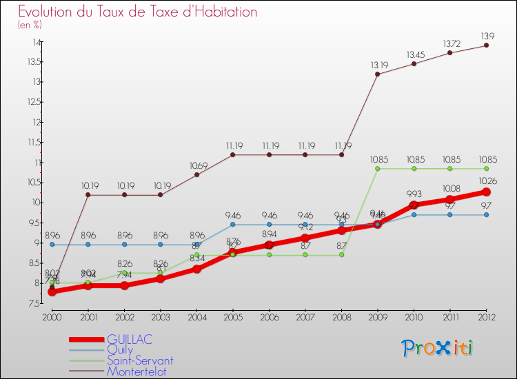 A Guillac, le taux de taxe d'habitation a ainsi augmenté de 31.88 % entre 2000 et 2012.