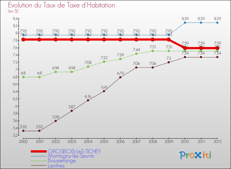 En 2012, le taux de la taxe d'habitation vôté par le conseil municipal de Grosbois-lès-Tichey était de : 7.59 %.