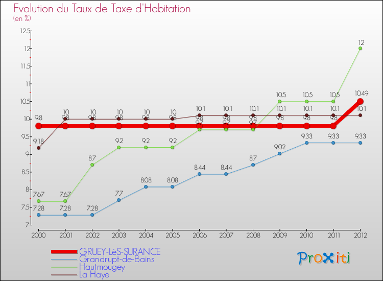 A Gruey-lès-Surance, le taux de taxe d'habitation a ainsi augmenté de 7.04 % entre 2000 et 2012.