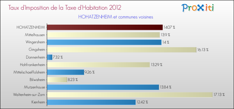En 2012, le taux de la taxe d'habitation vôté par le conseil municipal de Hohatzenheim était de : 14.07 %.