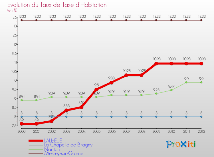 En 2012, le taux de la taxe d'habitation vôté par le conseil municipal de Lalheue était de : 10.93 %.