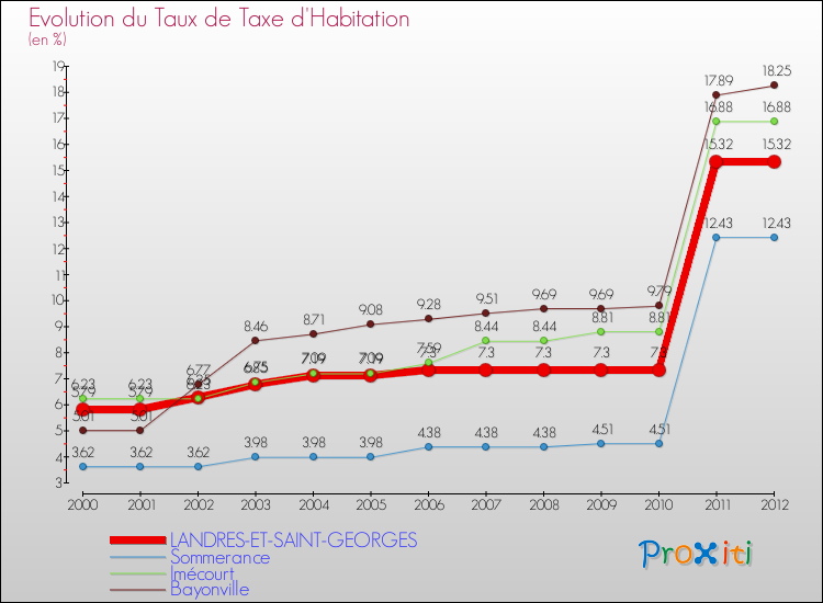 A Landres-et-Saint-Georges, le taux de taxe d'habitation a ainsi augmenté de 164.59 % entre 2000 et 2012.