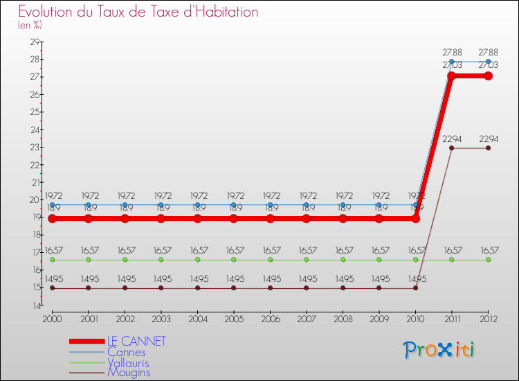 En 2012, le taux de la taxe d'habitation vôté par le conseil municipal de Le Cannet était de : 27.03 %.