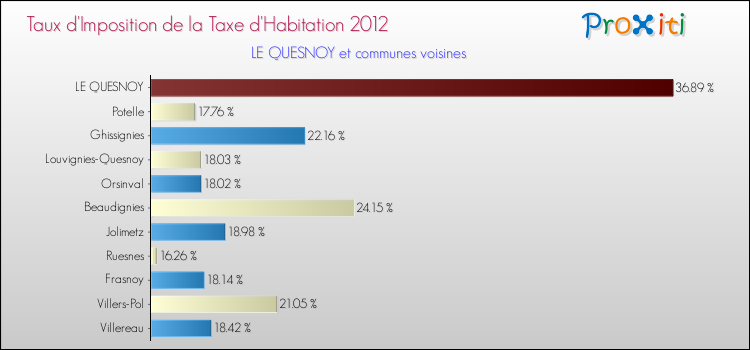 En 2012, le taux de la taxe d'habitation vôté par le conseil municipal de Le Quesnoy était de : 36.89 %.