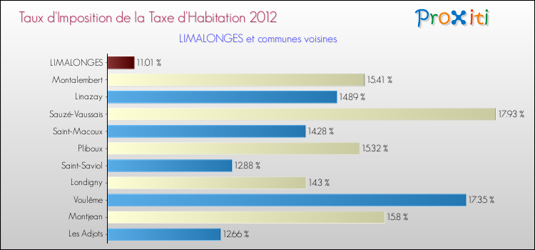 En 2012, le taux de la taxe d'habitation vôté par le conseil municipal de Limalonges était de : 11.01 %.