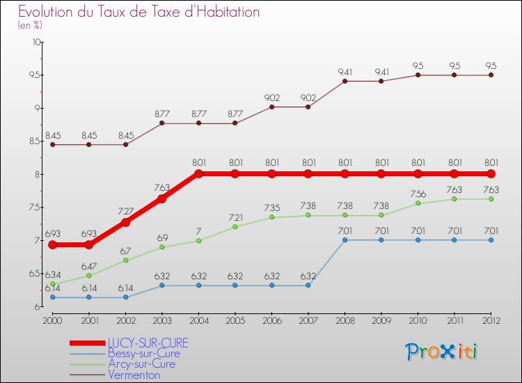 En 2012, le taux de la taxe d'habitation vôté par le conseil municipal de Lucy-sur-Cure était de : 8.01 %.