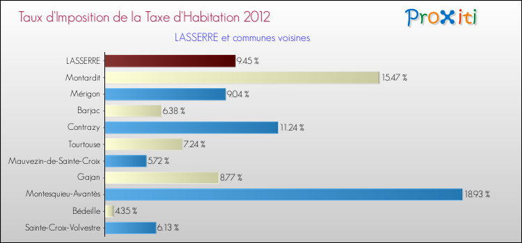 En 2012, le taux de la taxe d'habitation vôté par le conseil municipal de Lasserre était de : 9.45 %.