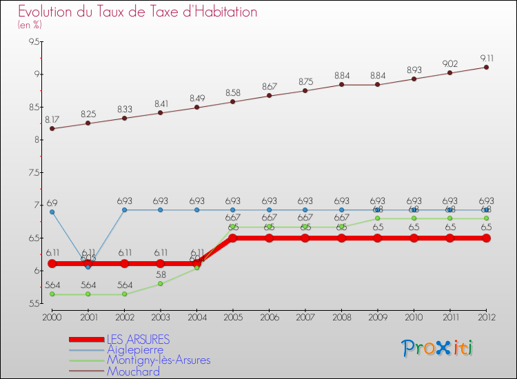 A Les Arsures, le taux de taxe d'habitation a ainsi augmenté de 6.38 % entre 2000 et 2012.