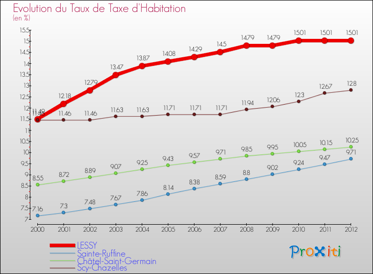 A Lessy, le taux de taxe d'habitation a ainsi augmenté de 30.64 % entre 2000 et 2012.
