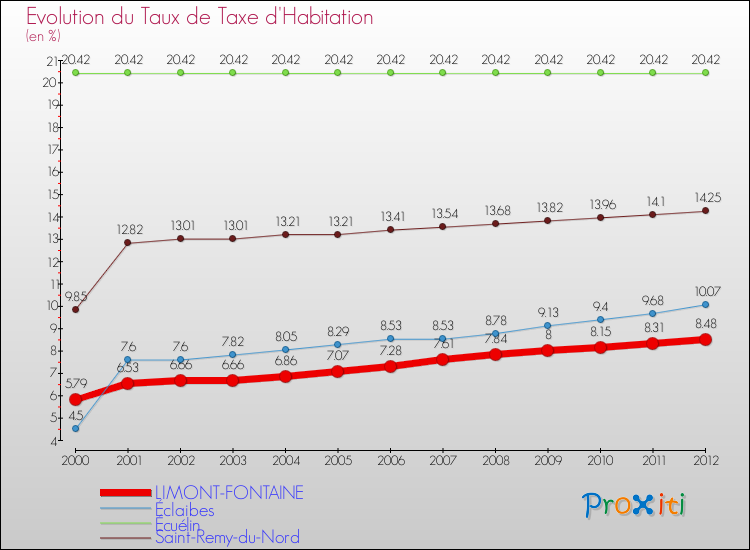 Pendant la même période, les communes françaises similaires à Limont-Fontaine, ont vu leur taux de taxe d'habitation augmenter de 29.1 % en moyenne entre 2000 et 2012.