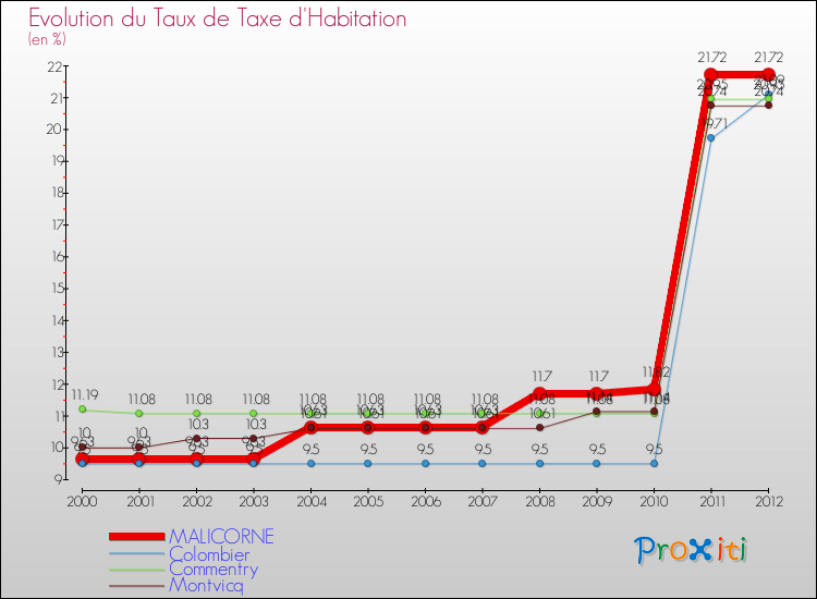 En 2012, le taux de la taxe d'habitation vôté par le conseil municipal de Malicorne était de : 21.72 %.