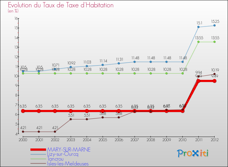 A Mary-sur-Marne, le taux de taxe d'habitation a ainsi augmenté de 49.45 % entre 2000 et 2012.