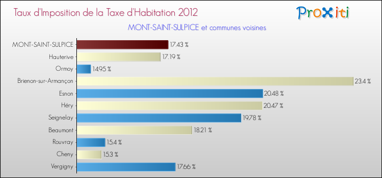En 2012, le taux de la taxe d'habitation vôté par le conseil municipal de Mont-Saint-Sulpice était de : 17.43 %.
