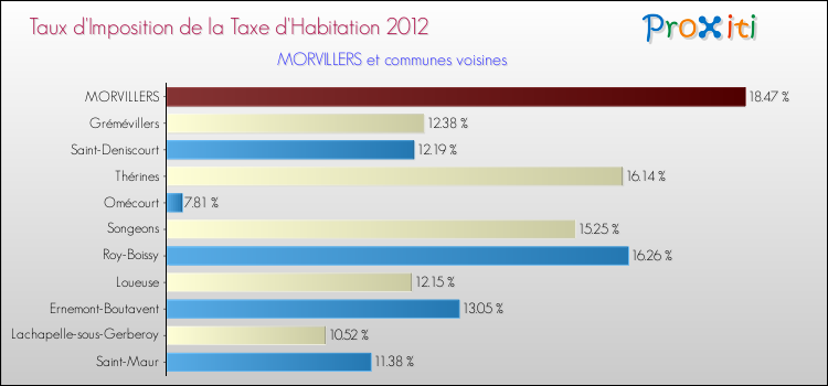 Vous trouverez ci-dessous des graphiques qui vous permettent de situer le taux de la taxe d'habitation de Morvillers par rapport aux communes voisines.