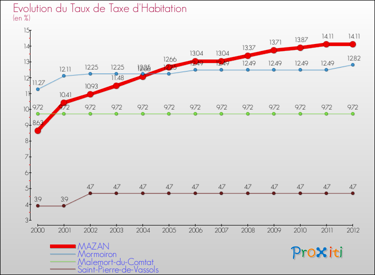 Pendant la même période, les communes françaises similaires à Mazan, ont vu leur taux de taxe d'habitation augmenter de 34.11 % en moyenne entre 2000 et 2012.