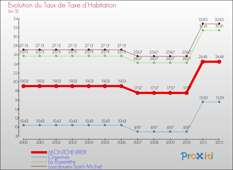A Montchevrier, le taux de taxe d'habitation a ainsi augmenté de 28.64 % entre 2000 et 2012.