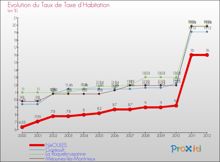 En 2012, le taux de la taxe d'habitation vôté par le conseil municipal de Néoules était de : 16 %.