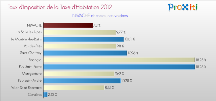 En 2012, le taux de la taxe d'habitation vôté par le conseil municipal de Névache était de : 7.3 %.