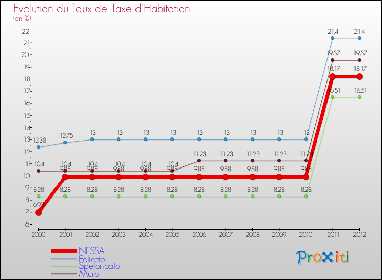 Pendant la même période, les communes françaises similaires à Nessa, ont vu leur taux de taxe d'habitation augmenter de 81.5 % en moyenne entre 2000 et 2012.