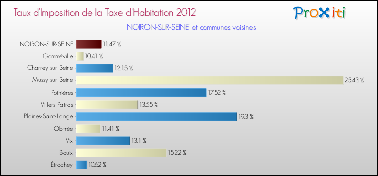 En 2012, le taux de la taxe d'habitation vôté par le conseil municipal de Noiron-sur-Seine était de : 11.47 %.