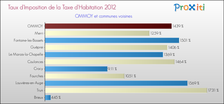 En 2012, le taux de la taxe d'habitation vôté par le conseil municipal de Ommoy était de : 14.39 %.