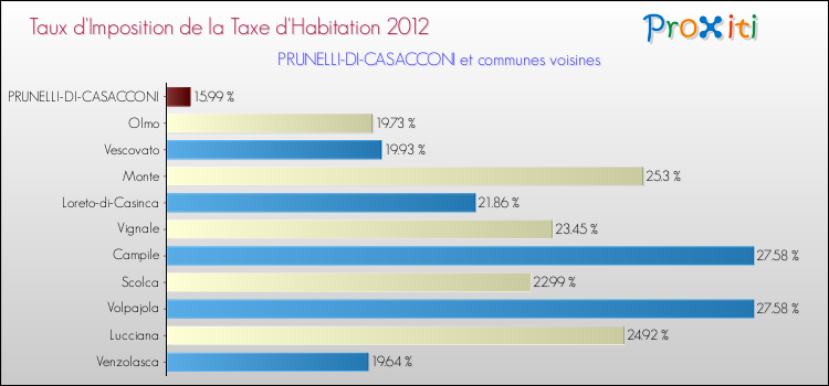 En 2012, le taux de la taxe d'habitation vôté par le conseil municipal de Prunelli-di-Casacconi était de : 15.99 %.