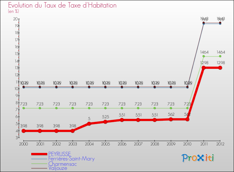 En 2012, le taux de la taxe d'habitation vôté par le conseil municipal de Peyrusse était de : 12.98 %.
