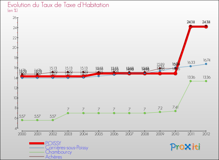 En 2012, le taux de la taxe d'habitation vôté par le conseil municipal de Poissy était de : 24.18 %.