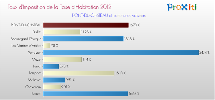 Pendant la même période, les communes françaises similaires à Pont-du-Château, ont vu leur taux de taxe d'habitation augmenter de 36.4 % en moyenne entre 2000 et 2012.