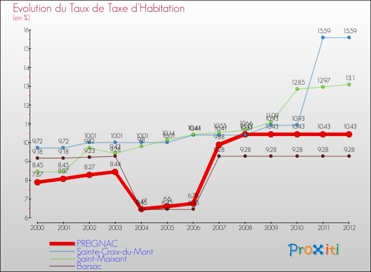 En 2012, le taux de la taxe d'habitation vôté par le conseil municipal de Preignac était de : 10.43 %.