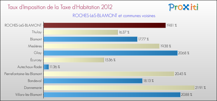 Vous trouverez ci-dessous des graphiques qui vous permettent de situer le taux de la taxe d'habitation de Roches-lès-Blamont par rapport aux communes voisines.