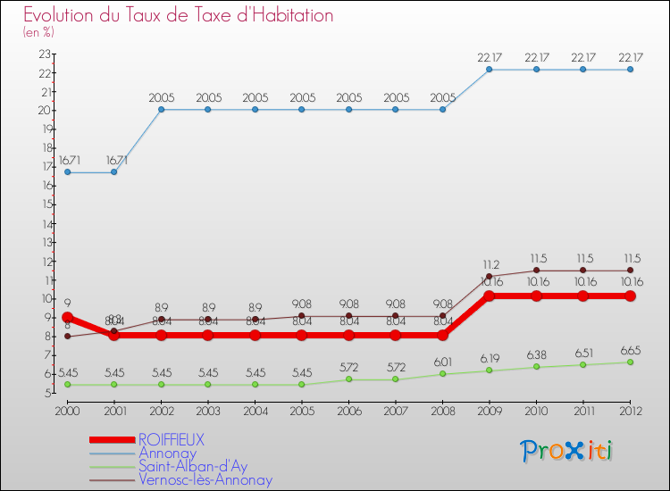 A Roiffieux, le taux de taxe d'habitation a ainsi augmenté de 12.89 % entre 2000 et 2012.