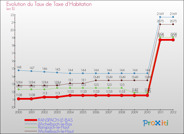 Pendant la même période, les communes françaises similaires à Ranspach-le-Bas, ont vu leur taux de taxe d'habitation augmenter de 77.08 % en moyenne entre 2000 et 2012.
