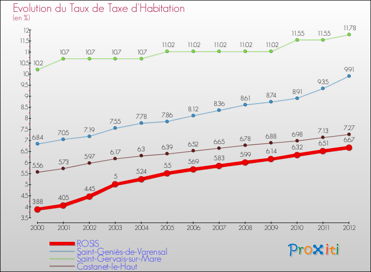 A Rosis, le taux de taxe d'habitation a ainsi augmenté de 71.91 % entre 2000 et 2012.