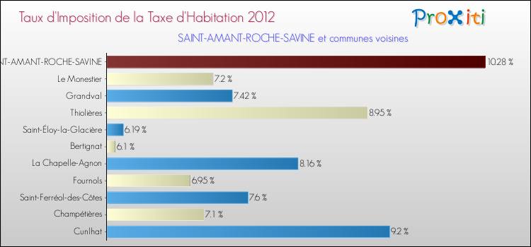 En 2012, le taux de la taxe d'habitation vôté par le conseil municipal de Saint-Amant-Roche-Savine était de : 10.28 %.