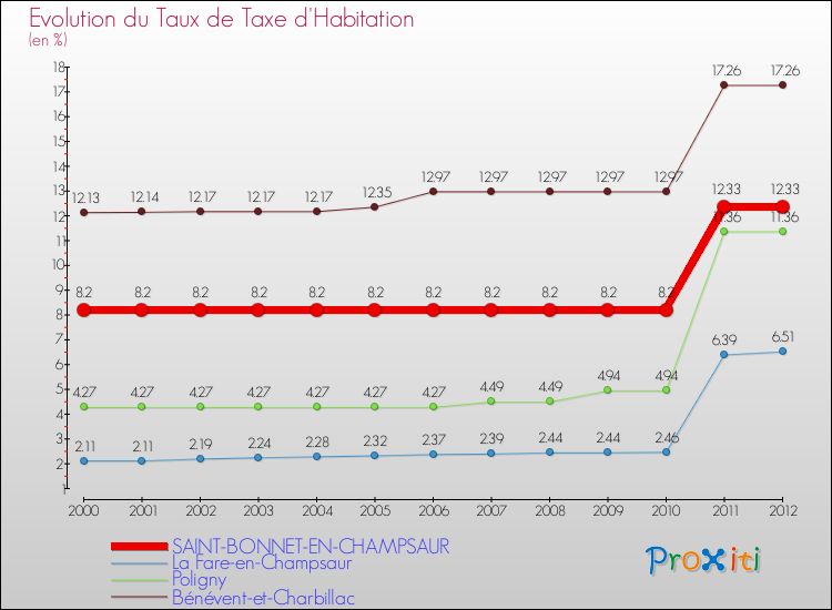 Pendant la même période, les communes françaises similaires à Saint-Bonnet-en-Champsaur, ont vu leur taux de taxe d'habitation augmenter de 98.24 % en moyenne entre 2000 et 2012.