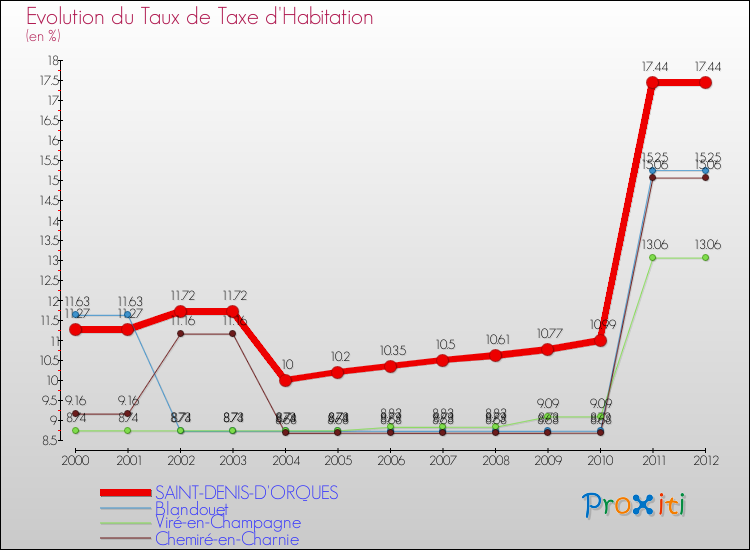 Pendant la même période, les communes françaises similaires à Saint-Denis-d'Orques, ont vu leur taux de taxe d'habitation augmenter de 72.43 % en moyenne entre 2000 et 2012.