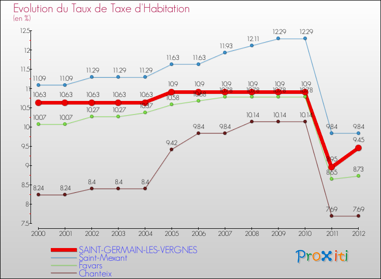 En 2012, le taux de la taxe d'habitation vôté par le conseil municipal de Saint-Germain-les-Vergnes était de : 9.45 %.