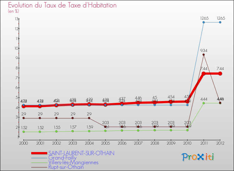 Pendant la même période, les communes françaises similaires à Saint-Laurent-sur-Othain, ont vu leur taux de taxe d'habitation augmenter de 110.98 % en moyenne entre 2000 et 2012.