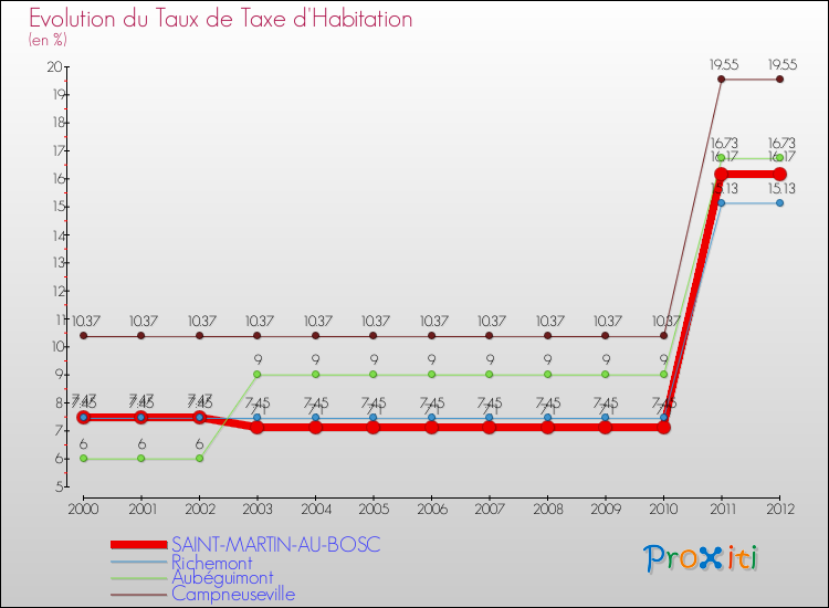 A Saint-Martin-au-Bosc, le taux de taxe d'habitation a ainsi augmenté de 116.47 % entre 2000 et 2012.
