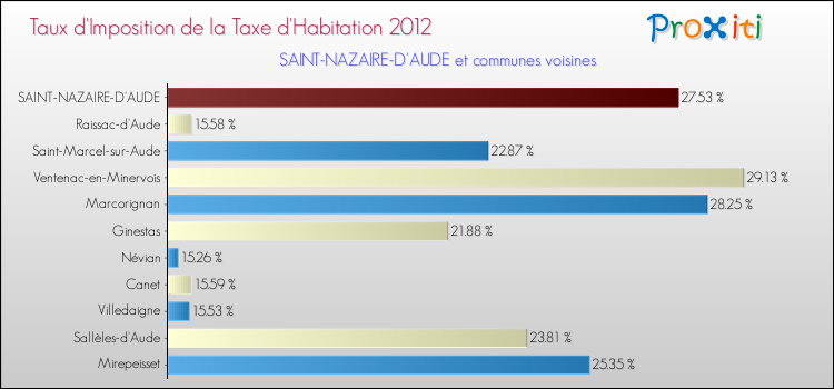 En 2012, le taux de la taxe d'habitation vôté par le conseil municipal de Saint-Nazaire-d'Aude était de : 27.53 %.