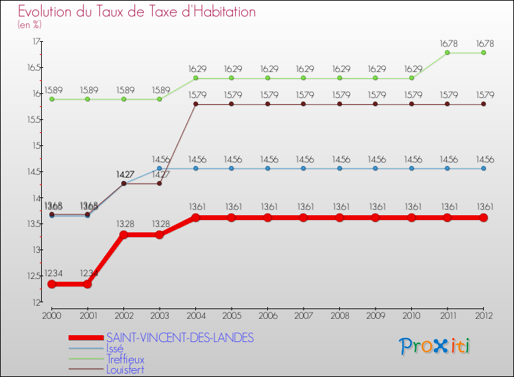 Pendant la même période, les communes françaises similaires à Saint-Vincent-des-Landes, ont vu leur taux de taxe d'habitation augmenter de 29.1 % en moyenne entre 2000 et 2012.