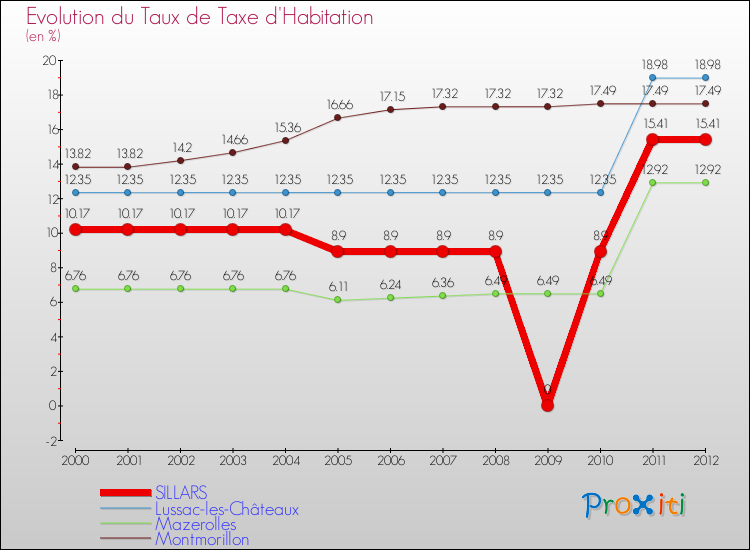Le graphique ci dessous représente l'évolution du taux de la taxe d'habitation à Sillars depuis 2000.