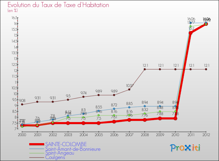 A Sainte-Colombe, le taux de taxe d'habitation a ainsi augmenté de 118.63 % entre 2000 et 2012.